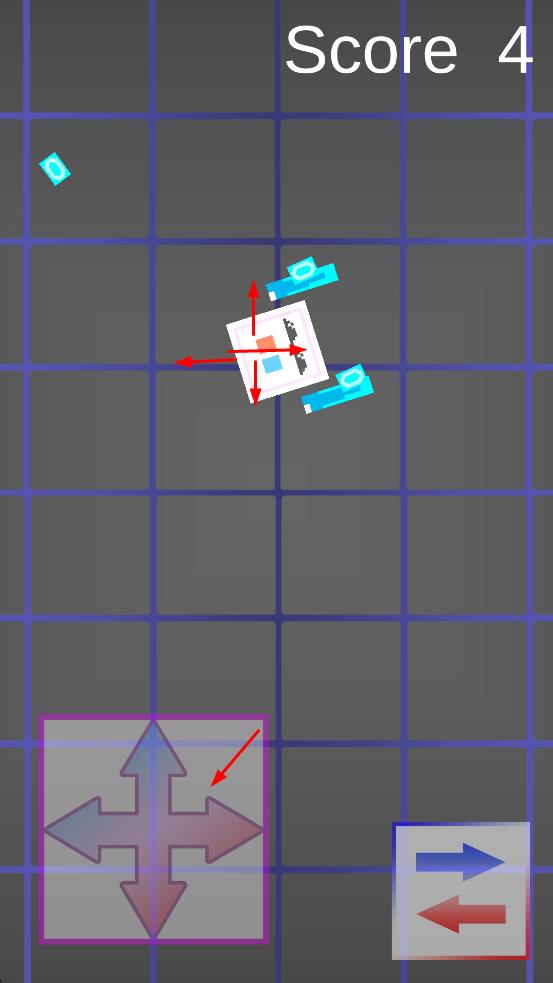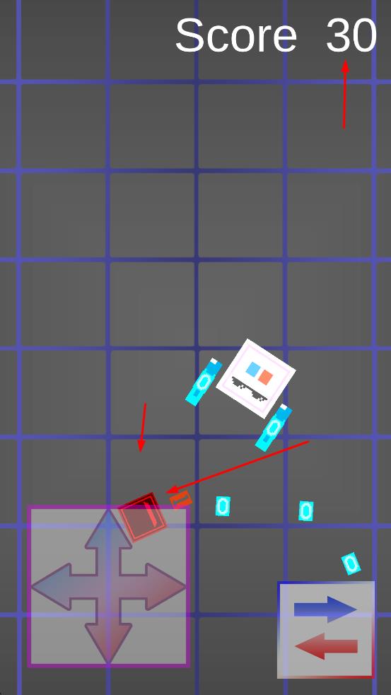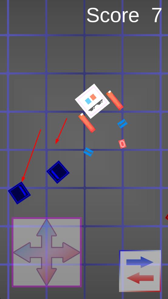 2、借助推力引导核心方块移动,碰撞收集蓝色小物件,累积Score分数。