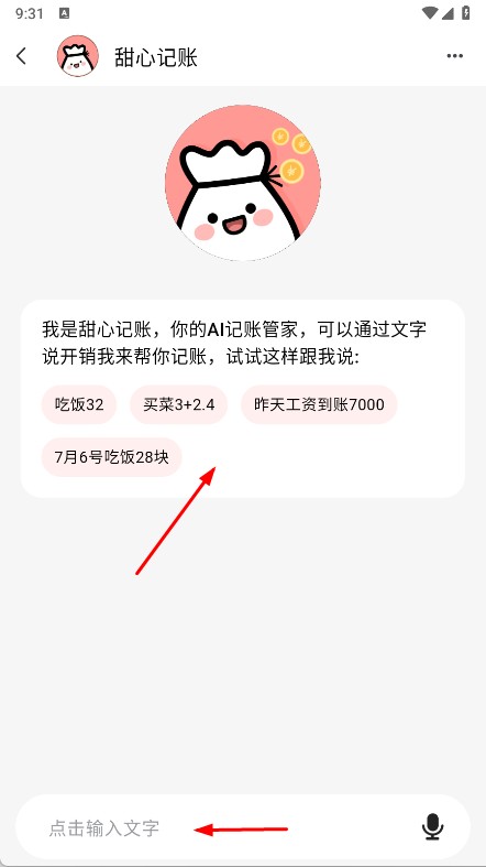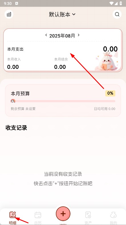 1、打开甜心记账,在明细页可查看本月收支、预算,点底部加号记账,也可进入AI记账,输入文字,让AI帮记。