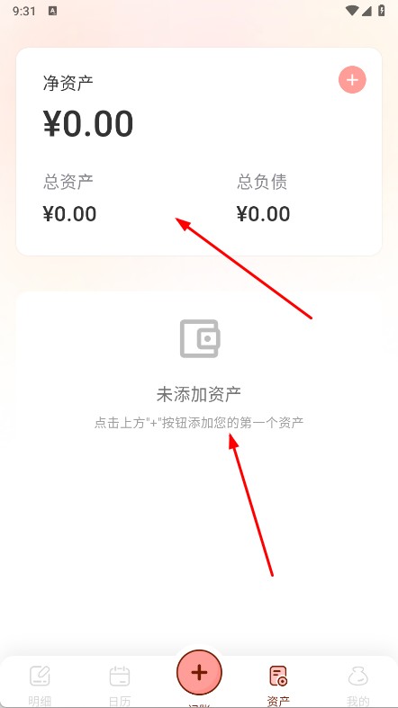 2、切换到资产页,点上方加号添加资产,管理净资产、总资产、总负债,掌握财务状况。