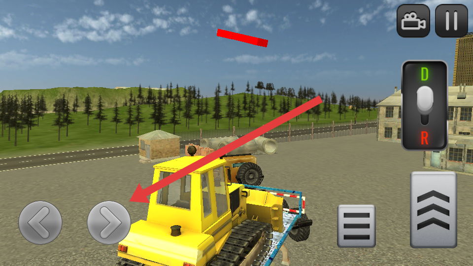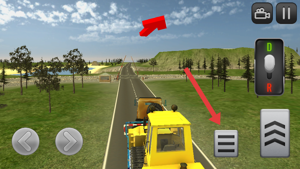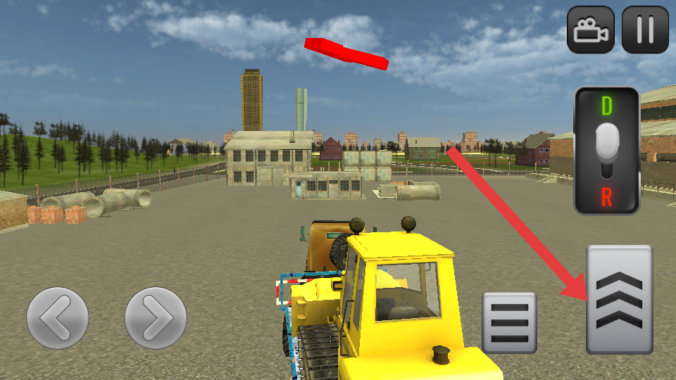 1、进入游戏,熟悉右侧前进档位切换D前进/R后退按键,点击对应按钮操控工程车移动,适应驾驶手感。