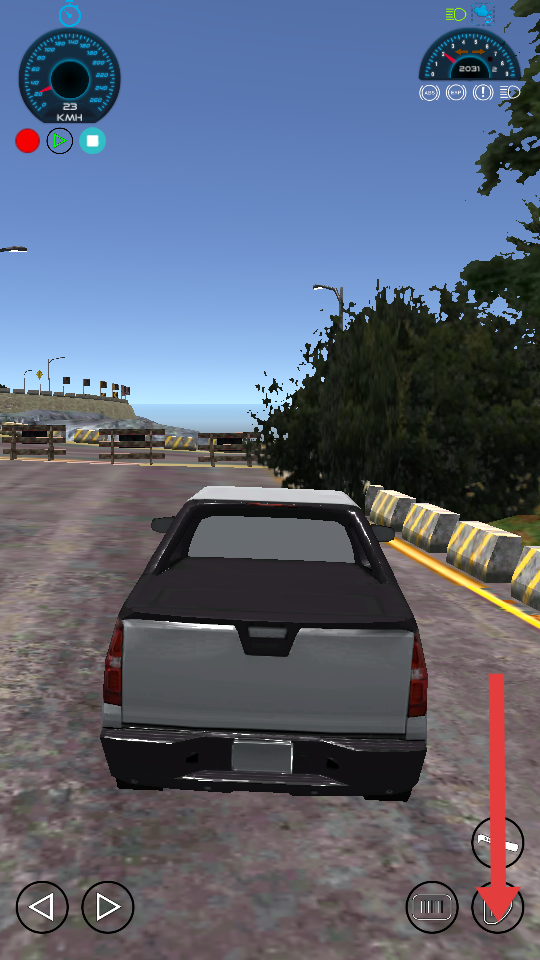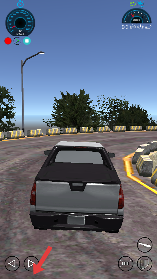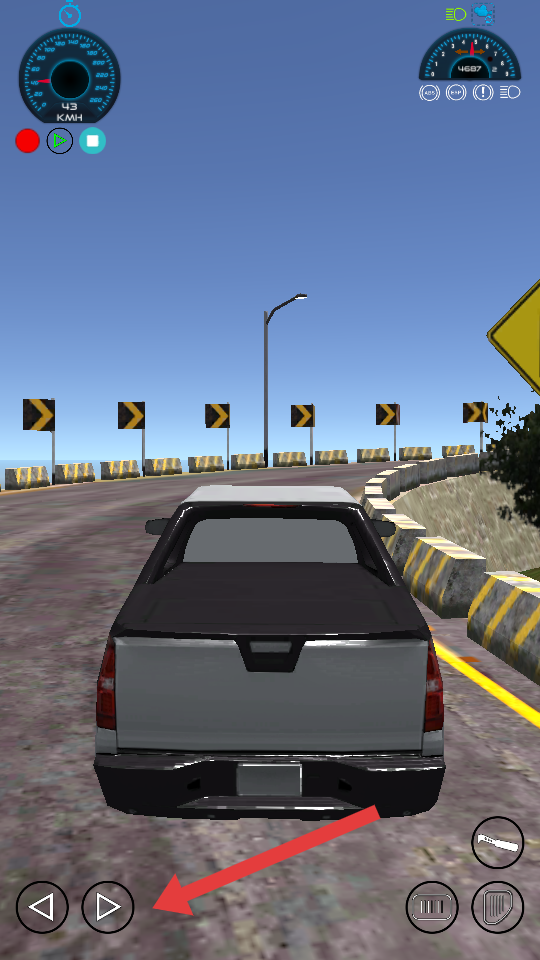 1、进入游戏,熟悉左下角方向按键前进、后退,点击绿色启动按钮,操控皮卡车起步,适应驾驶操作。