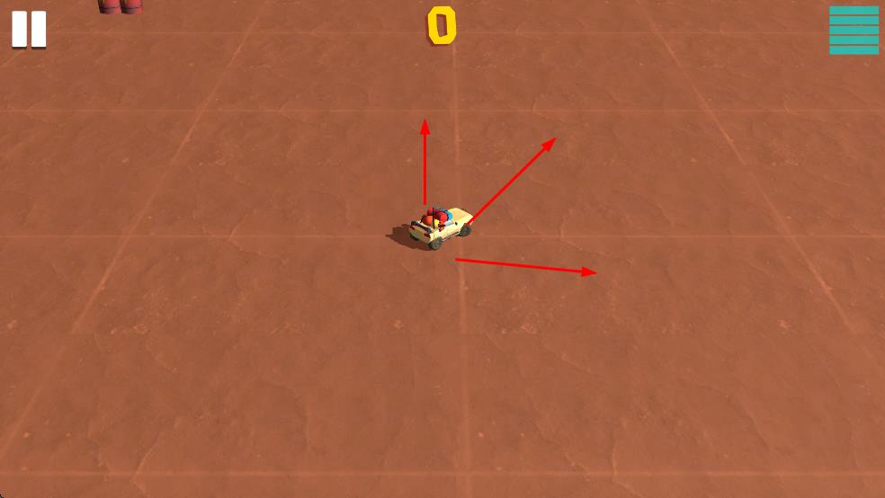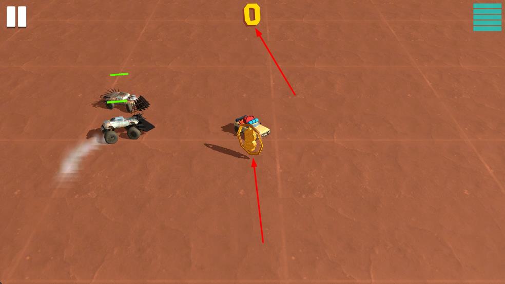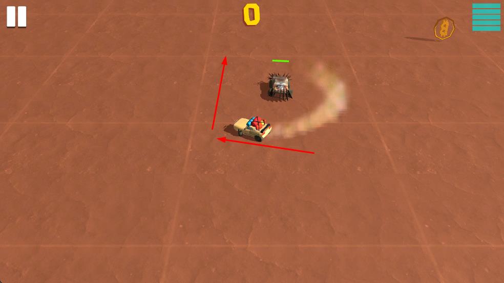 1、操控黄色赛车在荒漠场地移动,躲避敌方车辆的撞击。