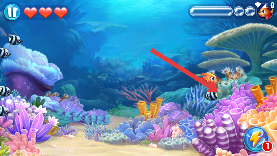 1、进入游戏,操控橙色小鱼初始的形态,移动角色吃小鱼,积累成长的经验,留意左上角的血量。
