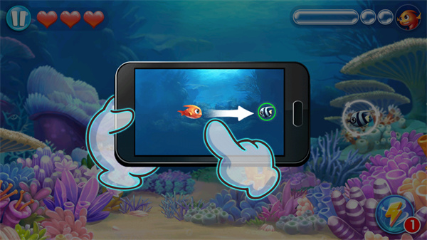 2、滑动屏幕捕食操作:进入关卡后,通过滑动屏幕控制当前鱼类移动方向,瞄准体型更小的鱼类进行捕食,每捕食一条鱼会增加一定捕食度,捕食直至捕食度满格。