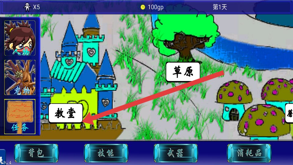 1、进入游戏,在地图界面点击草原,进入冒险场景,操控角色移动,熟悉方向键或触屏滑动。