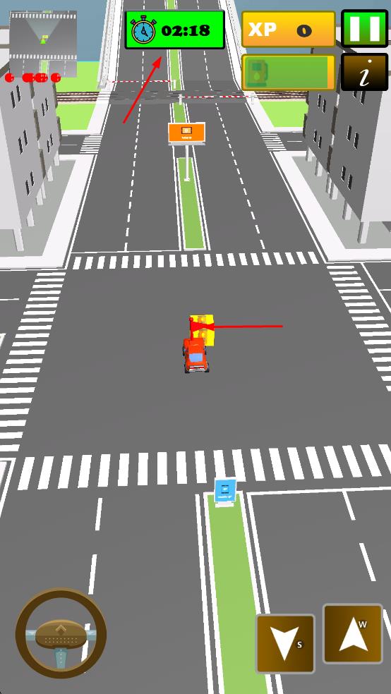 2、在道路行驶时,收集蓝、橙色方块道具,同时留意上方时间限制,争取高效完成任务。