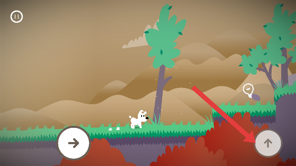 2、遇到台阶、沟壑,点击右下角跳跃键,让小狗越过障碍,注意跳跃时机如长距离沟壑需提前蓄力。