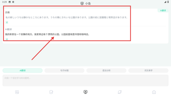 2、进入小岛页面,查看示例中日文对照及翻译内容,借助AI翻译等功能学习语言知识。