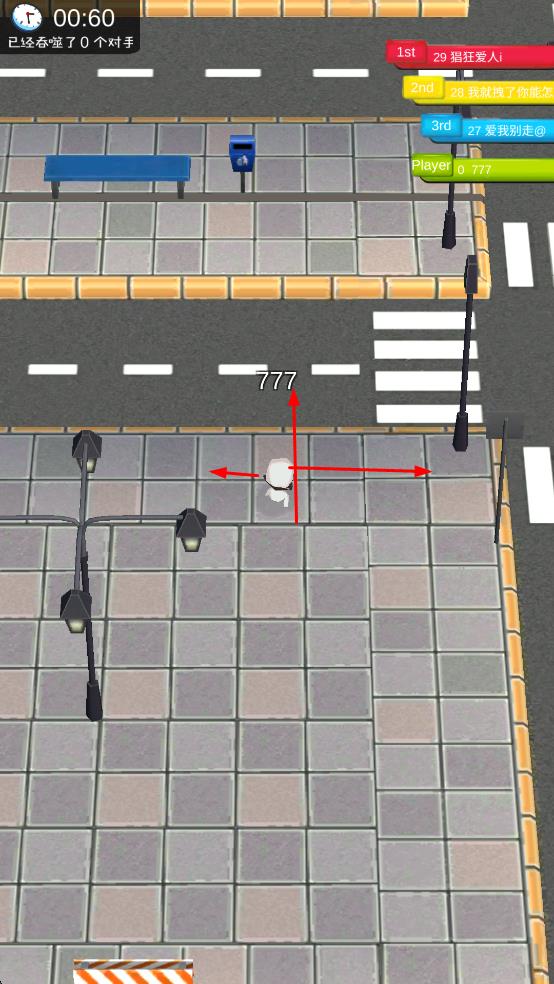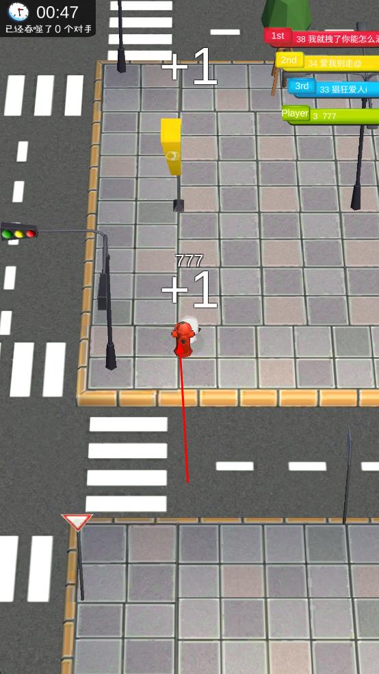 1、进入游戏后,操控白色角色在城市街道移动,吞噬路灯、消防栓等物体,提升自身标识数字。