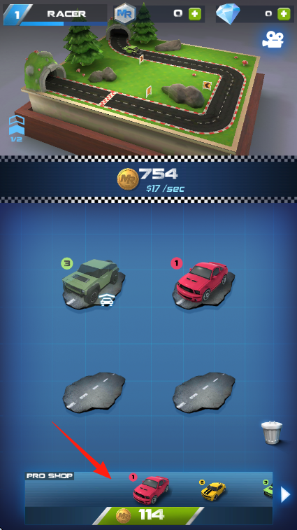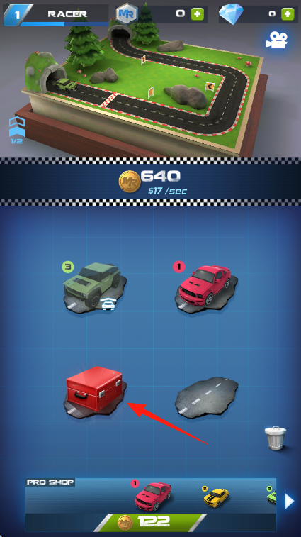 2、利用购买的赛车,在赛道区域上方展示的绿色草地赛道进行放置,通过赛车运营赚取金币。