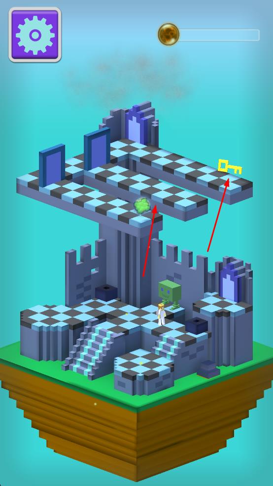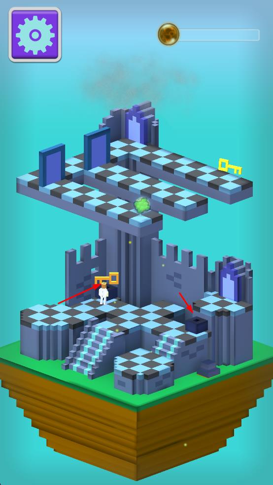 1、操控角色在棋盘格迷宫移动,收集黄色钥匙,解锁蓝色传送门,推进关卡进程。