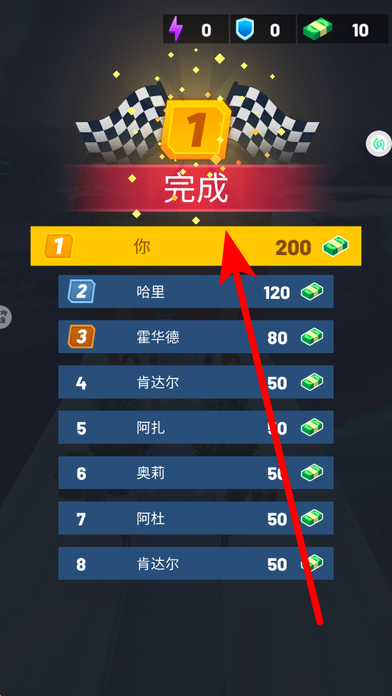 3、顺利冲过终点线后,查看最终排名与奖励,名次越是靠前奖励便越丰厚,使用奖励对摩托进行升级,或解锁全新赛车手,提升后续竞速比拼能力。