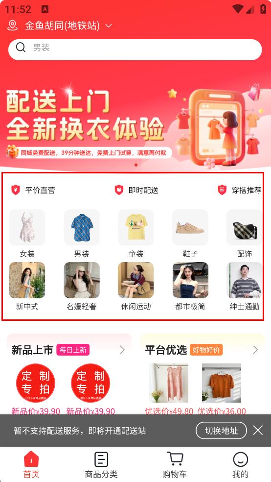 1、通过【即时配送】等分类,快速找女装,男装等品类,点穿搭推荐板块,获取搭配灵感,体验配送上门。