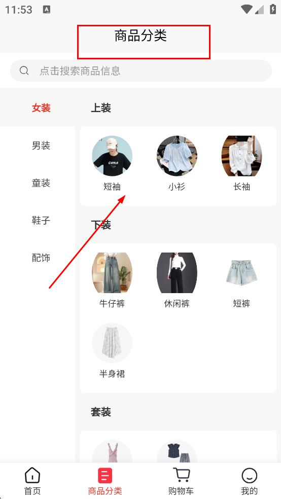 2、切换到商品分类页,左侧选品类,右侧点具体分类,精准筛选商品,浏览对应类目下的服饰,方便选购。