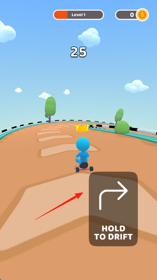1、进入游戏,留意屏幕上方的等级进度条【Level1】和金币数量【0$】,点击屏幕右侧【HOLDTODRIFT】按钮准备漂移。