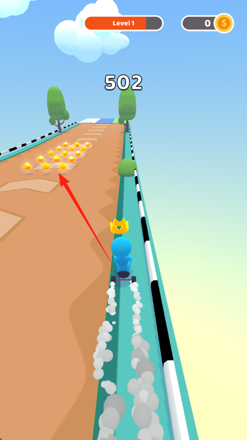 2、驾驶蓝色小人的三轮车前进,收集赛道上的金币红箭头所指,增加金币数量用于后续升级或购买道具。