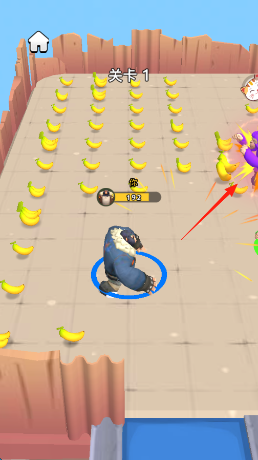 1、进入【关卡1】,操控蓝色角色在满是香蕉的区域移动,收集香蕉增加数量如【香蕉+20】。