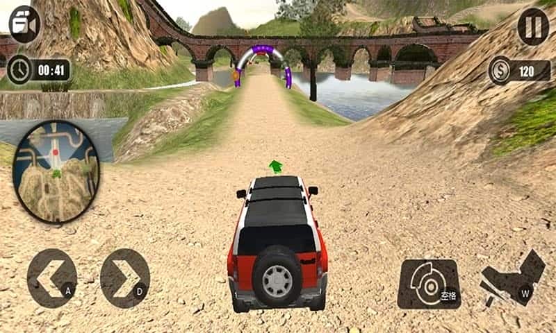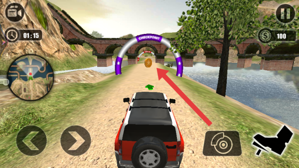 1、开局驾驶车辆,通过左下角方向键控制行驶方向,瞄准紫色CHECKPOINT拱门前进,收集路上金币。