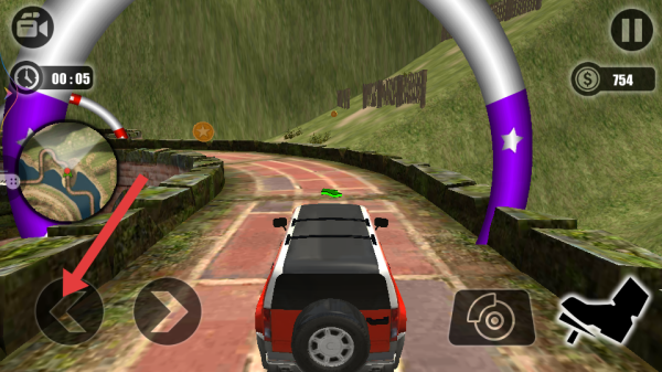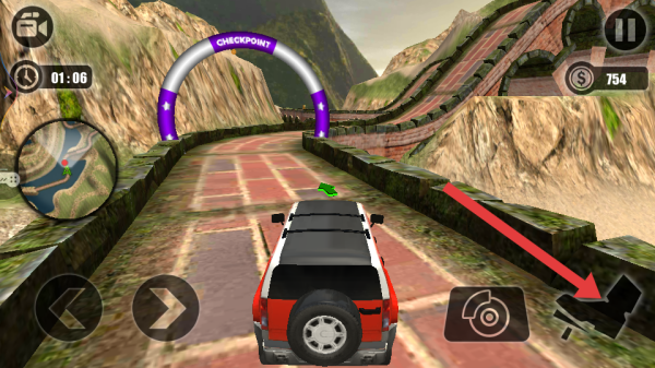 3、遇到连续坡道时,灵活操作方向键,把控车辆爬坡节奏,沿绿色箭头指引路线,更高处CHECKPOINT推进。