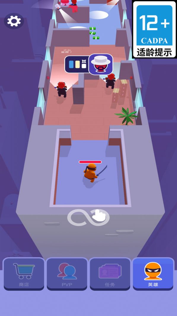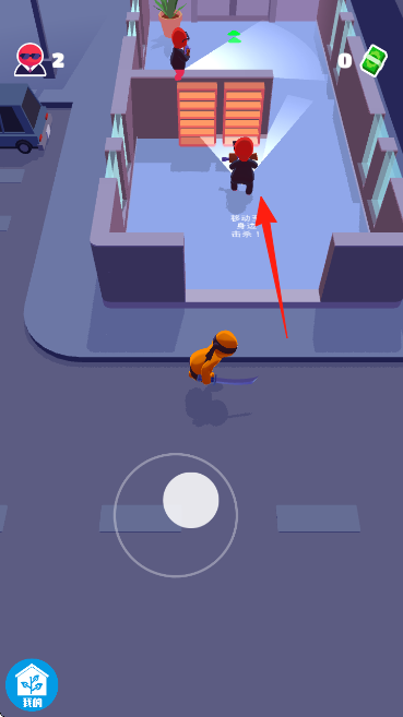 1、操控橙色角色移动,利用左下角虚拟摇杆接近红箭头所指的黑衣敌人,避开敌人的光线视野范围。