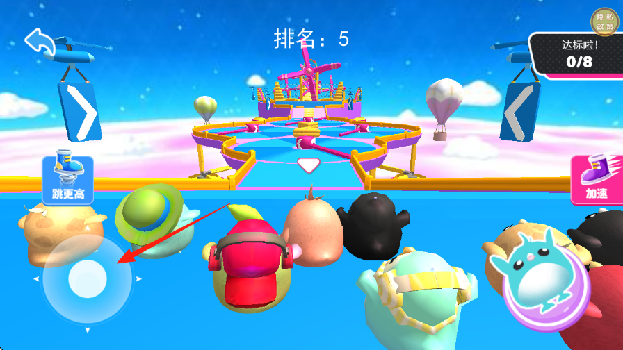 1、进入游戏,通过左下角虚拟摇杆操控角色移动,观察右上角排名初始为5和达标进度0/8。