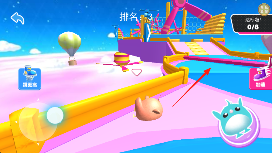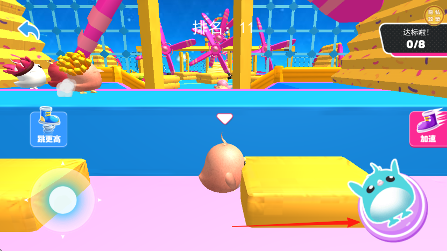 3、遇到障碍物时,可点击左侧【跳更高】按钮,让角色跳跃躲避,持续前进,争取达标并获得靠前排名通关。