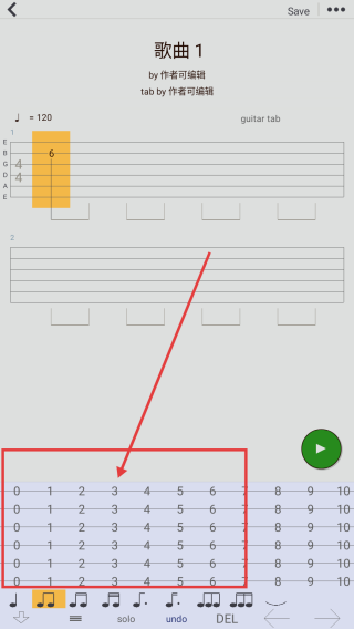 3、打开乐谱编辑页,利用底部音轨区域,编写音符、调试节奏,创作吉他曲谱内容。