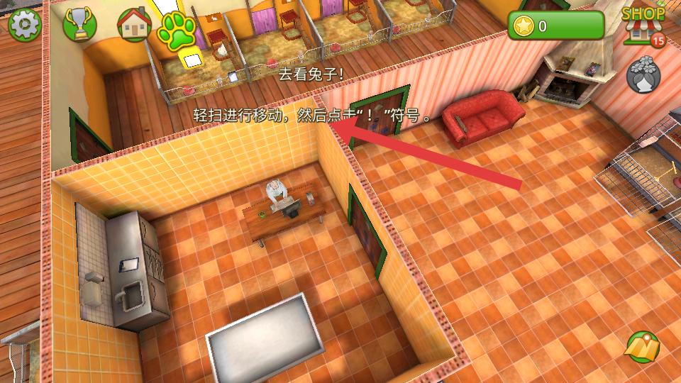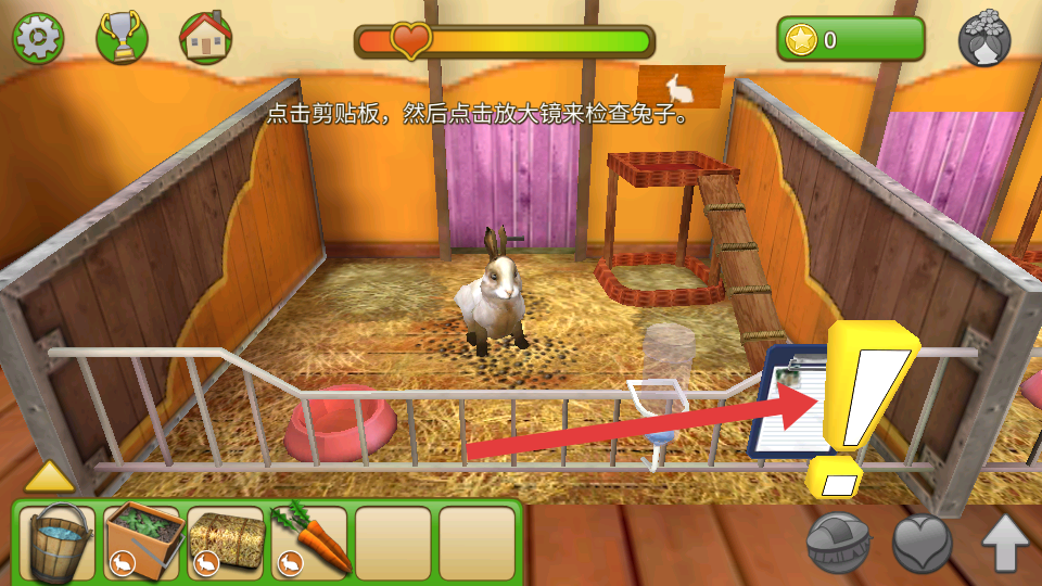 2、在兔子围栏旁,点击剪贴板带!标识,再点击放大镜,对兔子进行健康检查,完成基本互动。