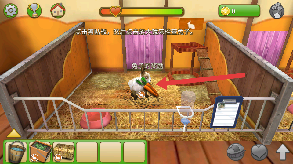 3、检查后,从下方道具栏选胡萝卜喂食兔子,提升亲密度,后续可通过打扫、投喂等日常操作。