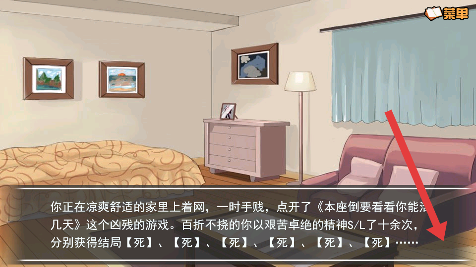 1、初始现代卧室场景,快速浏览剧情了解穿越背景,点击菜单可查看存档、设置,确认后推进对话。