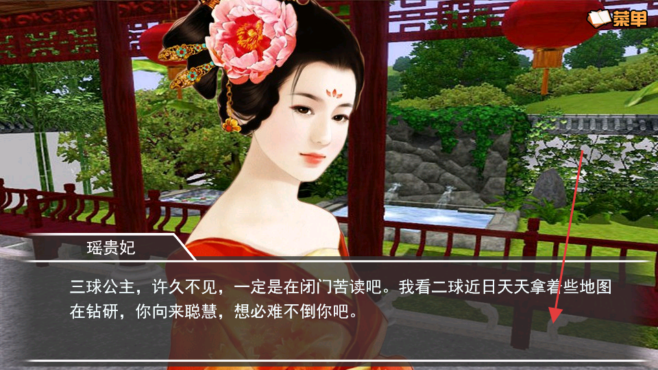 3、园林遇瑶贵妃对话,留意提及地图钻研等信息,选择回应,结合前期剧情塑造角色如聪慧、装傻。