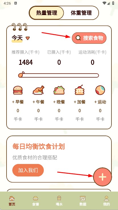 1、打开热量减肥小本fit卡路里,在首页点搜索食物,查食物热量,点加号,选日期和餐型,记录饮食,掌握热量摄入。