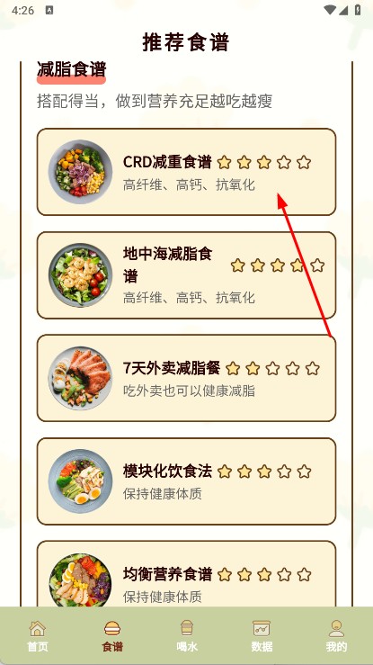 2、切换到食谱页,选推荐减肥食谱,如CRD减重食谱,规划健康饮食,辅助瘦身。