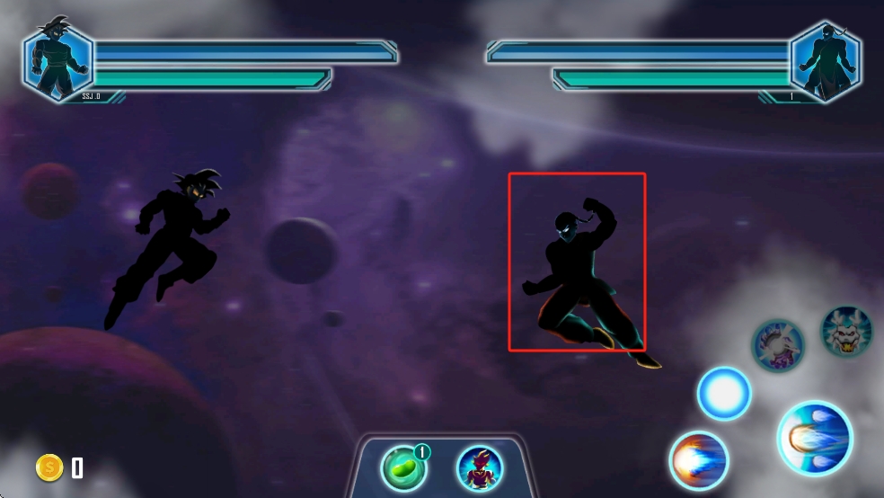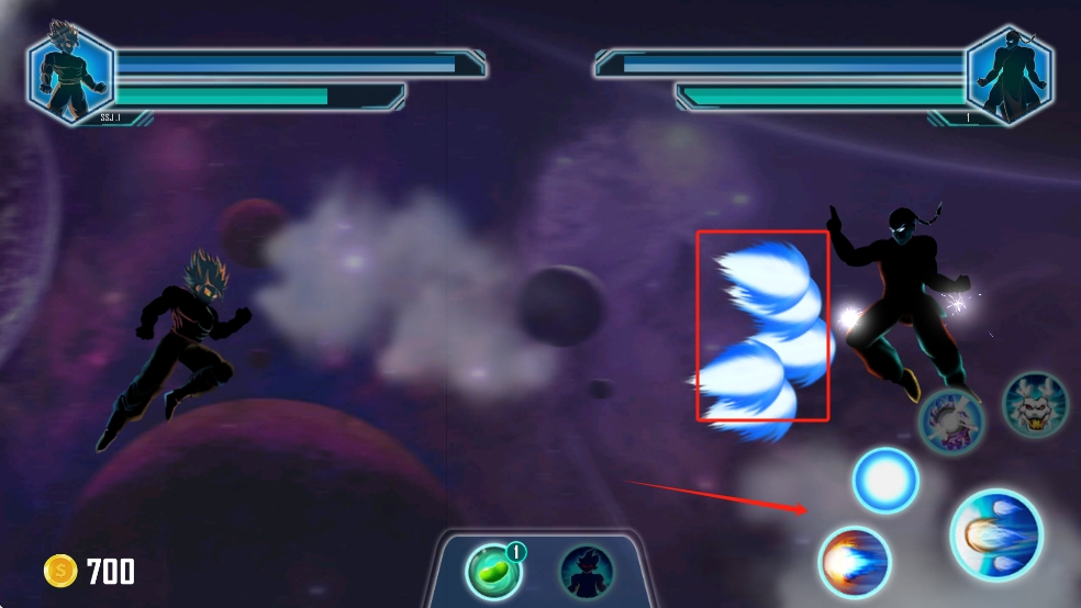 2、当对手处于攻击前摇时,点击右侧技能按键,释放蓝色光波技能,对敌方造成伤害,同时注意自身血量。