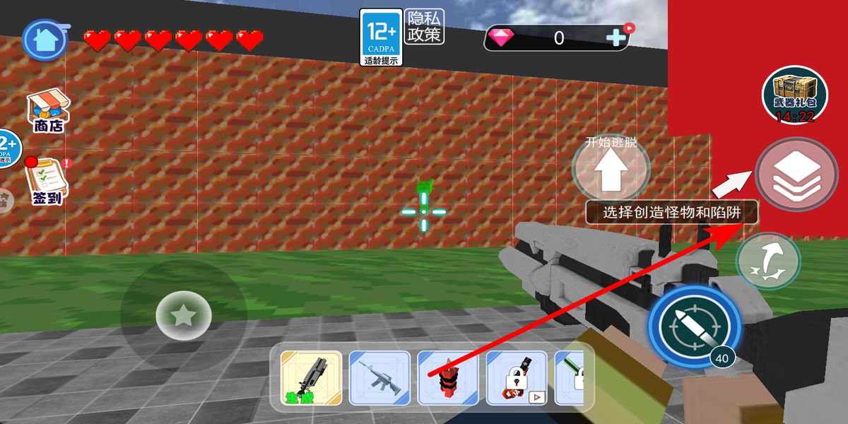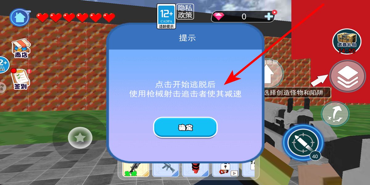 1、开局弹出提示框,阅读点击开始逃脱后,使用枪械射击追击者使其减速的说明,利用右侧功能按钮选择创造怪物或陷阱,在场景中布置障碍,为逃脱战构建防御优势。
