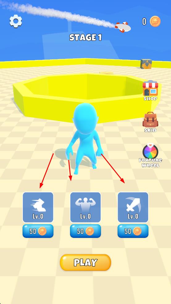 1、在STAGE1界面,消耗金币升级速度、力量、攻击技能,强化角色属性。