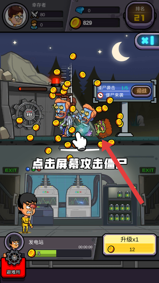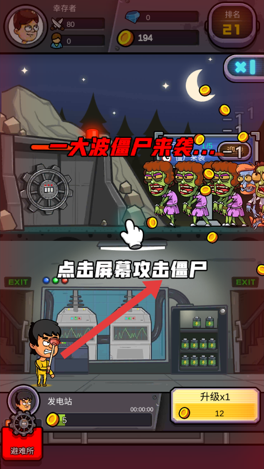 3、波次间隙如僵尸袭击1/5→2/5,点击雇员招募帮手,科技升级攻击或者防御,保持点击的频率清僵尸。