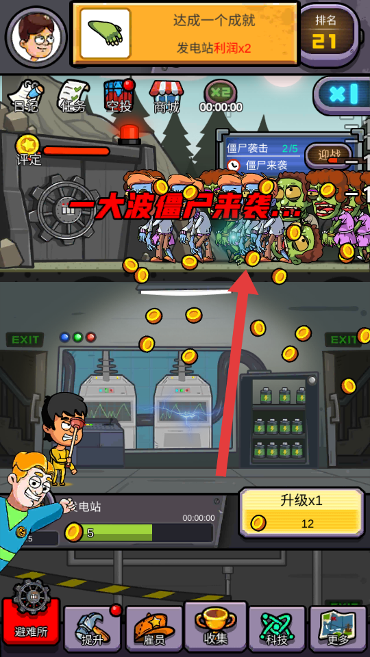 2、金币积累后,点击下方升级如发电站,提升建筑产出发电站利润×2成就易触发,同步看任务栏领奖励。