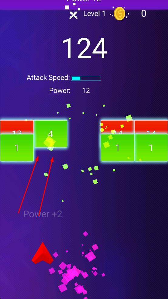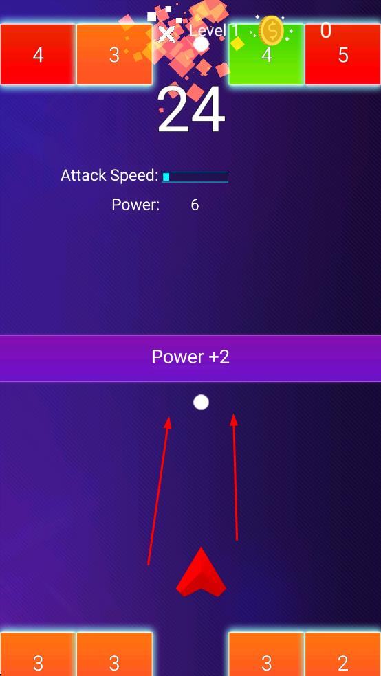 1、调整下方红色箭头方向,发射小球撞击方块,借助初始力量值,开启游戏撞击流程。