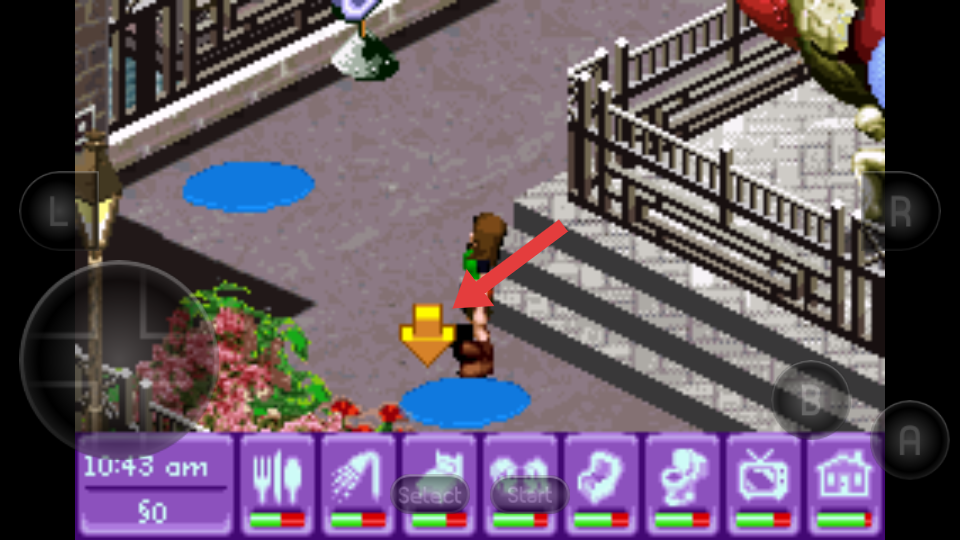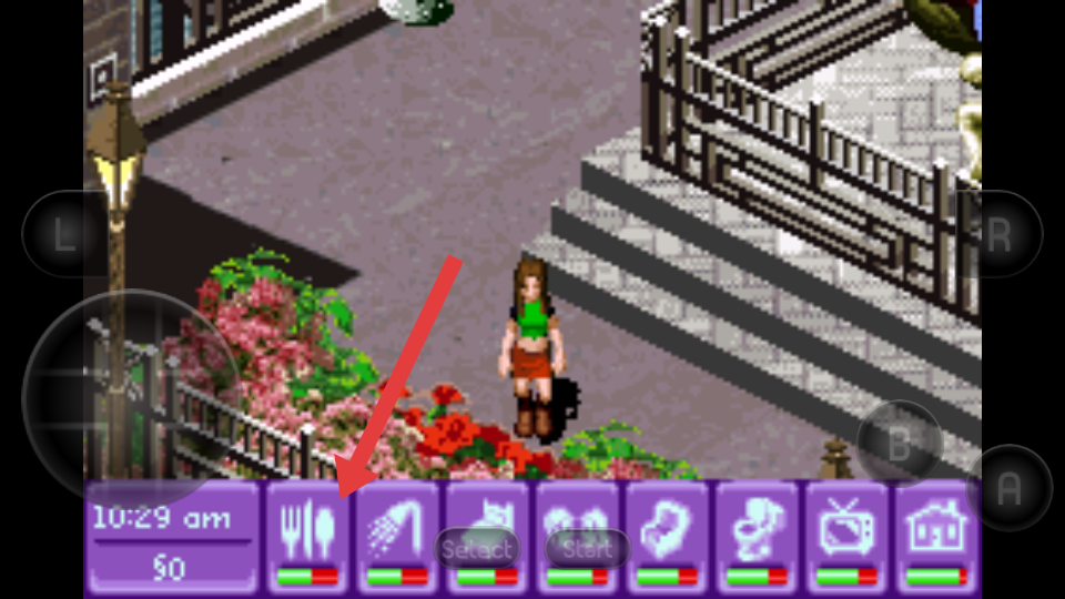 1、进入游戏,用虚拟摇杆控制角色移动踩蓝色格子触发事件,关注下方需求条饮食、清洁等变红前,点击按钮。
