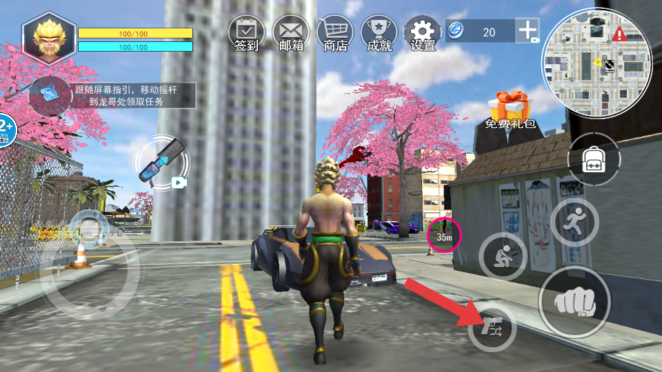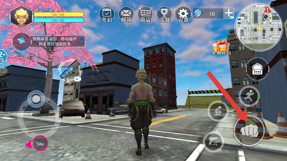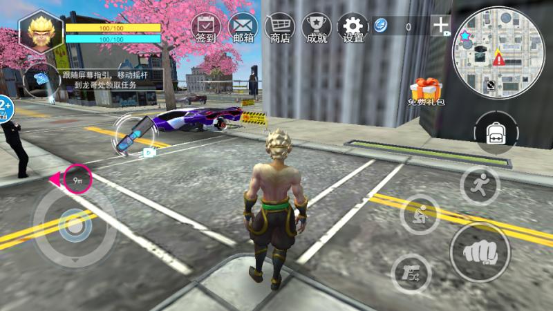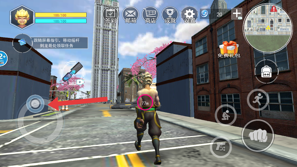 1、开局看屏幕指引,用左侧摇杆控制移动,往龙哥处粉色距离标识58m→77m→35m走,触发任务引导。