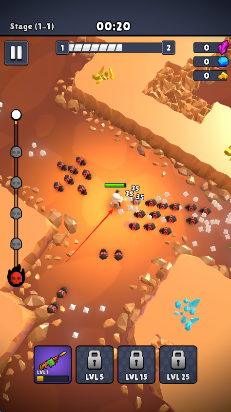 1、进入【Stage1-1】关卡,在限时内操控角色,利用初始【LVL1】枪械射击如红箭头所指的敌人,获取分数。