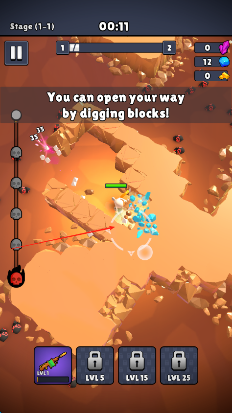 2、留意提示【You can open your way by digging blocks!】,射击并破坏石块开辟道路,收集途中蓝色水晶资源。