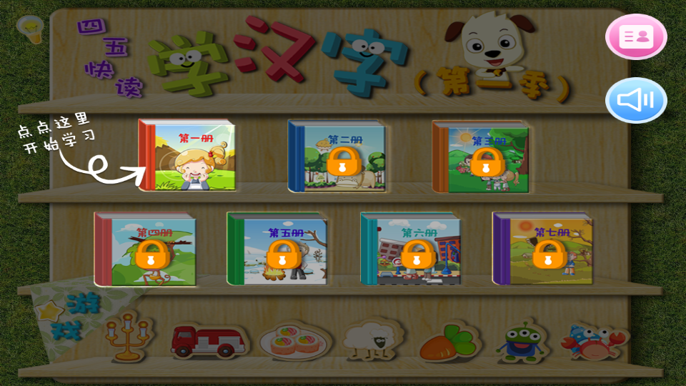 1、第一册没上锁可以直接点进去学,左下角那个黄色灯泡和点点这里开始学习的提示超贴心,小朋友一看就知道该点哪里,旁边的小狗图案也让整个界面更活泼了。