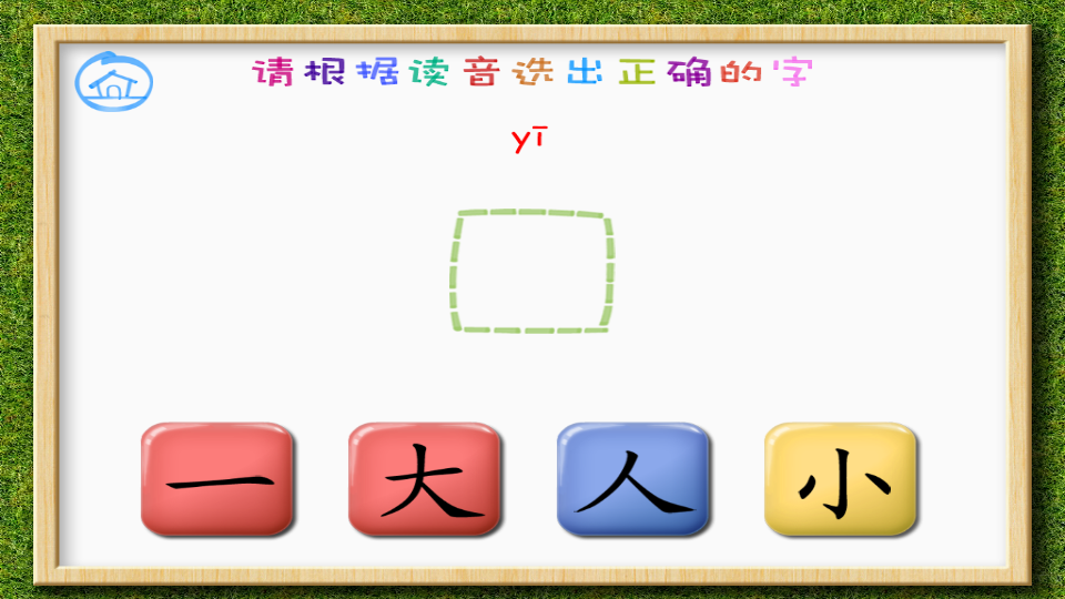 3、顶部红色拼音yī特别醒目,小朋友要根据读音在下面四个彩色按钮里选对字,选错了也没关系可以重来,蓝色小房子图标还能随时返回主页。