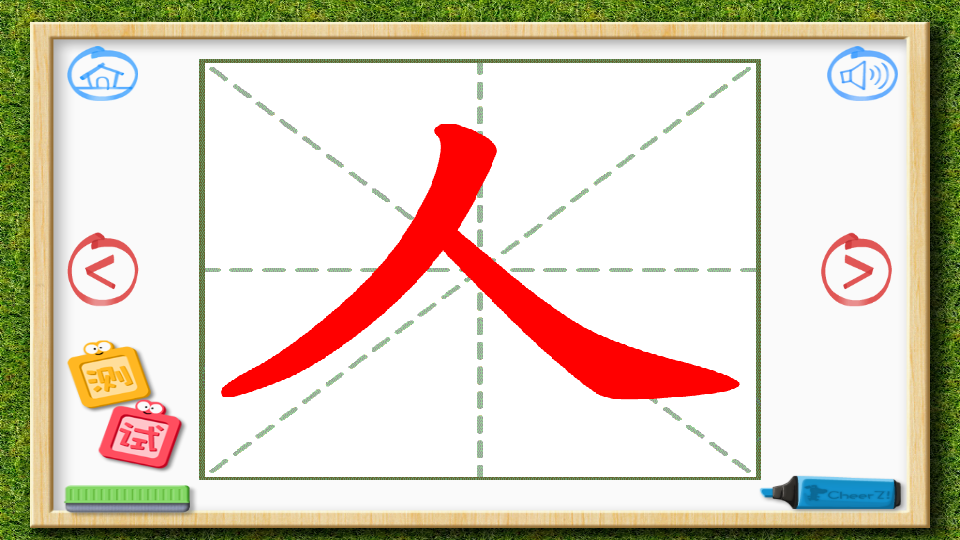 2、中间的米字格里用红色大字展示人字,想练习就点下面那个红色试字按钮,直接在屏幕上写就行,左侧黄色测字按钮可以检查学习成果。
