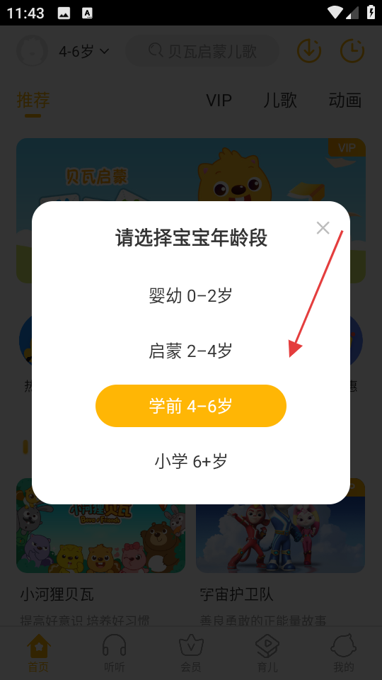 1、先让孩子自己点选适合的年龄段,比如学前4-6岁这个选项,选完后界面会自动推荐适合的内容,家长可以指着屏幕上的数字跟孩子一起数数,顺便教他们认识不同的年龄段划分。