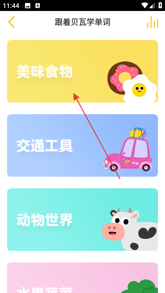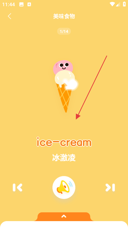 3、点击喇叭图标让孩子跟读单词发音,家长可以适当夸张口型帮助孩子模仿,学完一个单词后,鼓励孩子自己点击箭头切换到下一个,培养他们的自主学习能力。
