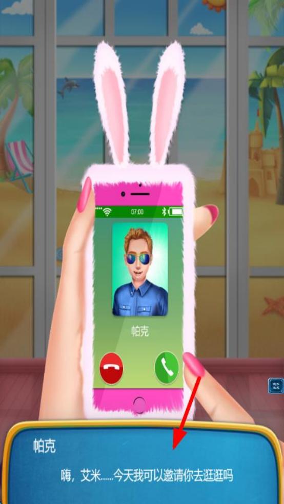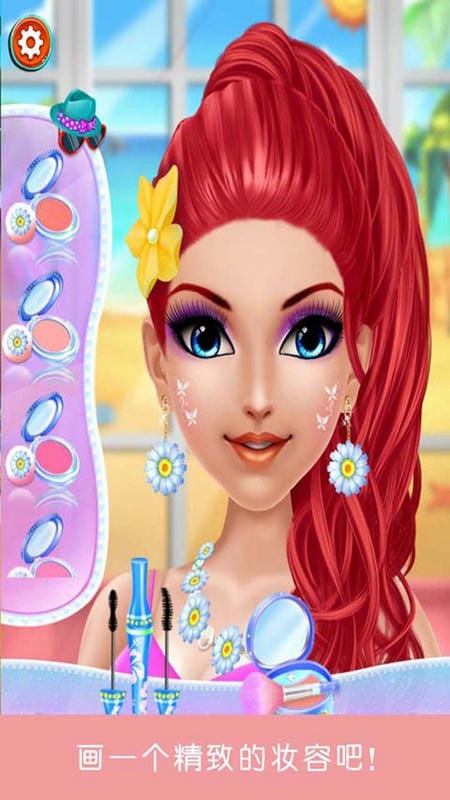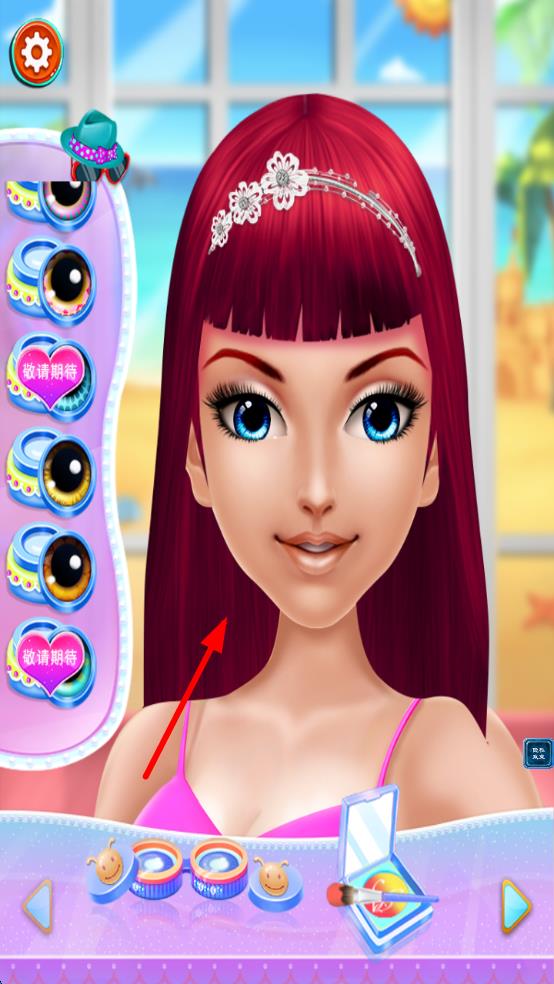 1、进入游戏后,在海滩主题界面选择要装扮的公主,点击化妆台开始妆容设计,通过滑动选择眼影、口红等彩妆,熟悉基础的化妆操作。