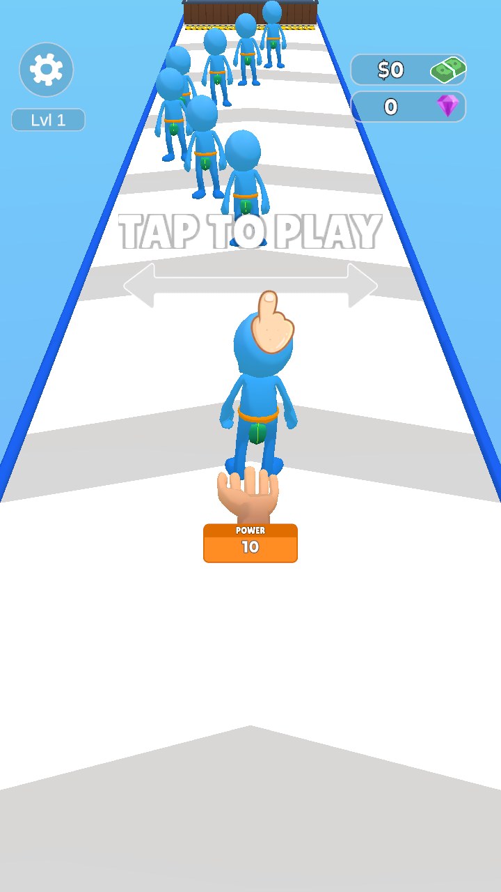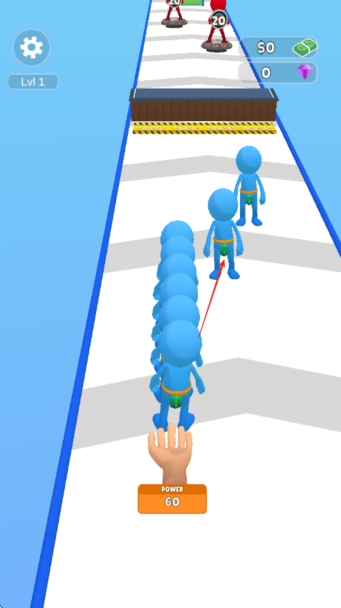 1、游戏初始在【Lvl1】,通过点击【POWER】按钮,集结蓝色小人,壮大队伍规模。